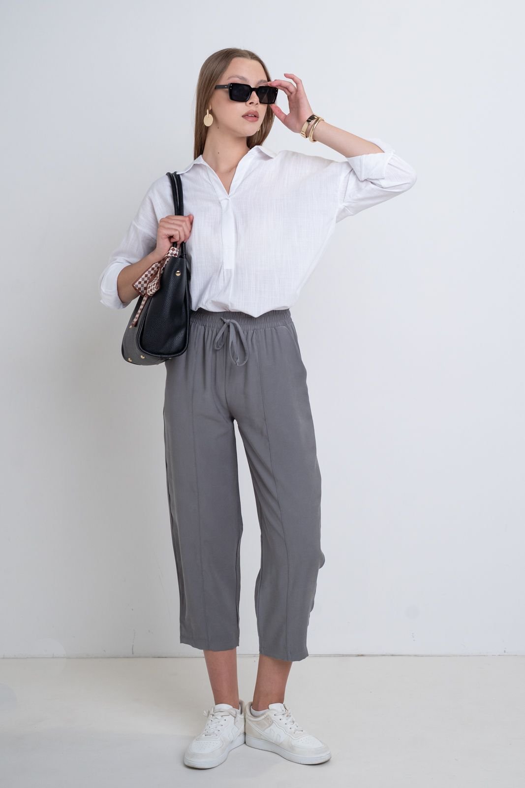 Παντελόνα με ελαστική μέση και κορδονάκια. Σχέδιο με ανάγλυφη ραφή στο μπατζάκι. Σύνθεση : 95% POLYESTER/ 5% ELASTANE