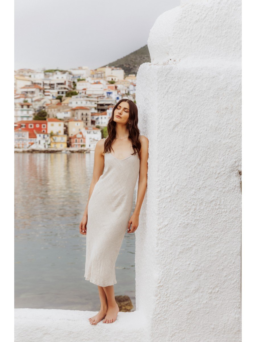 Φόρεμα Λινάρι τιράντα σε ύφασμα φυσικό ανάγλυφο (ζακάρ). 100% ελληνικής παραγωγής από το 1985.