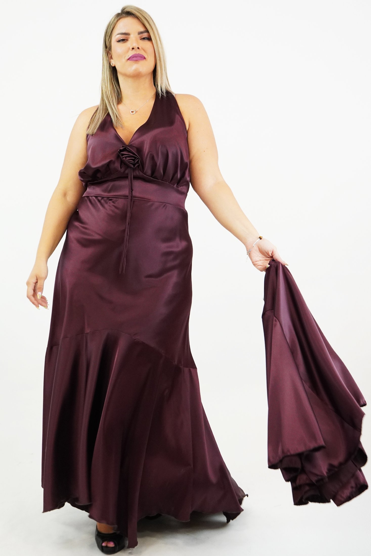 Φόρεμα μάξι εξώπλατο σε σατέν ελαστικό ύφασμα, V ντεκολτέ, διακριτικό και κομψό τριαντάφυλλο στο μπούστο ίδιου υφάσματος, τριγωνική μπάσκα στην μέση, άνιση λόξά κομμένη φούστα με κλος τελείωμα σε Α γραμμή για απίστευτη άνεση και κομψόπτητα.