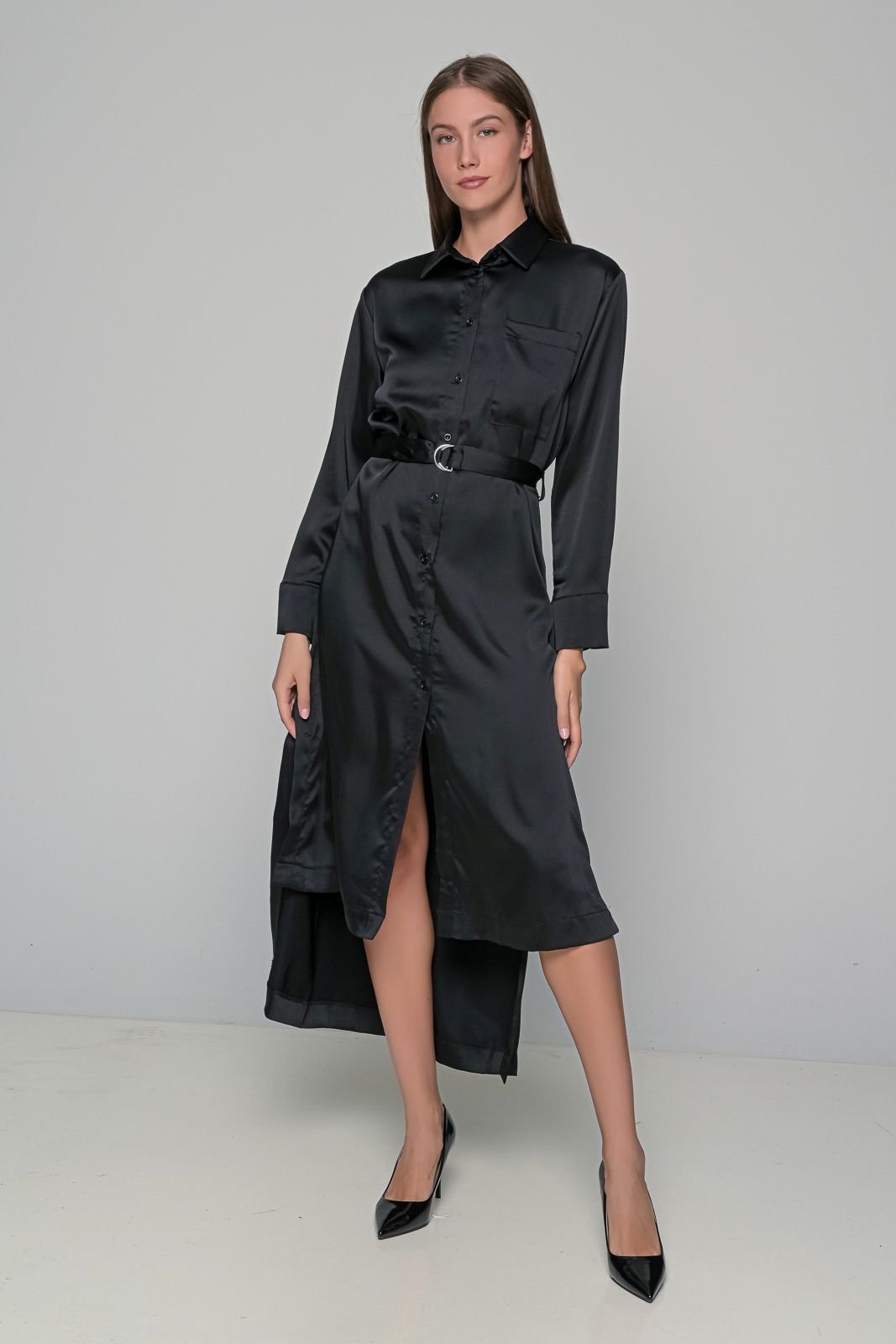 Φόρεμα μακρύ ασύμμτερο με ζώνη. Σατέν ύφανση. Γιακάς πουκαμίσου. Κλείνει μπροστά με κουμπιά. Σύνθεση : 100% POLYESTER