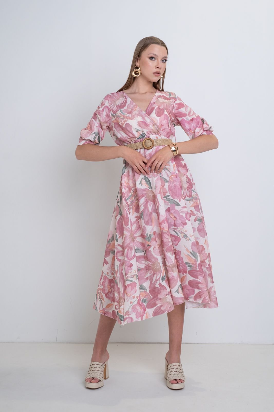 Φλοράλ maxi φόρεμα με κρουαζέ ντεκολτέ. Μανίκι 3/4 που στενεύει στο τελείωμα με φάσα. Ελαστική μέση. Ζώνη. Εβαζέ γραμμή. Σύνθεση : 100% POLYESTER